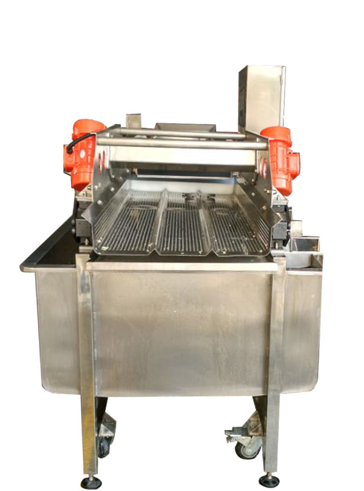 利用清洗凈水形成渦流,使物料處于渦流的凈水中清洗。物料被清洗時(shí),是和清洗水槽中的凈水一起作螺旋運(yùn)動(dòng),物料清洗后受水動(dòng)力作用被推進(jìn)振動(dòng)輸送機(jī)構(gòu),而送出清洗機(jī)。